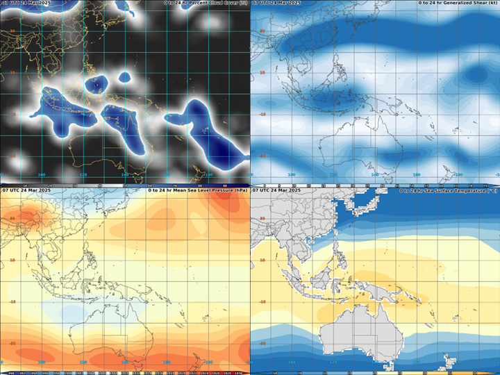 The geostationary satellite data, sourced from GOES-R, Himawari-8/-9, and Meteosat Second and Third Generation, includes key indicators such as Percent Cloud Cover Depth (PCCD) and Brightness Temperature of Water Vapor (BTWM). Oceanic conditions include SST observations from the Group for High-Resolution Sea Surface Temperature (GHRSST). While large-scale environmental parameters encompass a range of factors, including Mean Sea Level Pressure (MSLP), vertical wind shear (VSHS and VSHG), and convective instability (THCV, CIN, and VVAC). Lower MSLP suggests higher cyclone formation potential, while excessive wind shear can disrupt storm development. Convective instability indicators help assess conditions for storm activity.