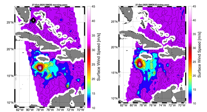 SMOS is an ESA EO mission launched in 2009 with the objective of measuring soil moisture and ocean salinity to improve forecasting and aid climate studies. The onboard Microwave Imaging Radiometer using Aperture Synthesis (MIRAS) operates in the L-band (1.14 GHz) to capture microwave emissions from Earth's surface. ]The mission provides key wind products, such as SMOS Near Real-Time Wind Speeds and Wind Radii Fixes, which support storm tracking and intensity analysis. By offering rapid, high-resolution wind data, SMOS enhances real-time tropical cyclone forecasts and contributes to improved storm preparedness. 33) 34)