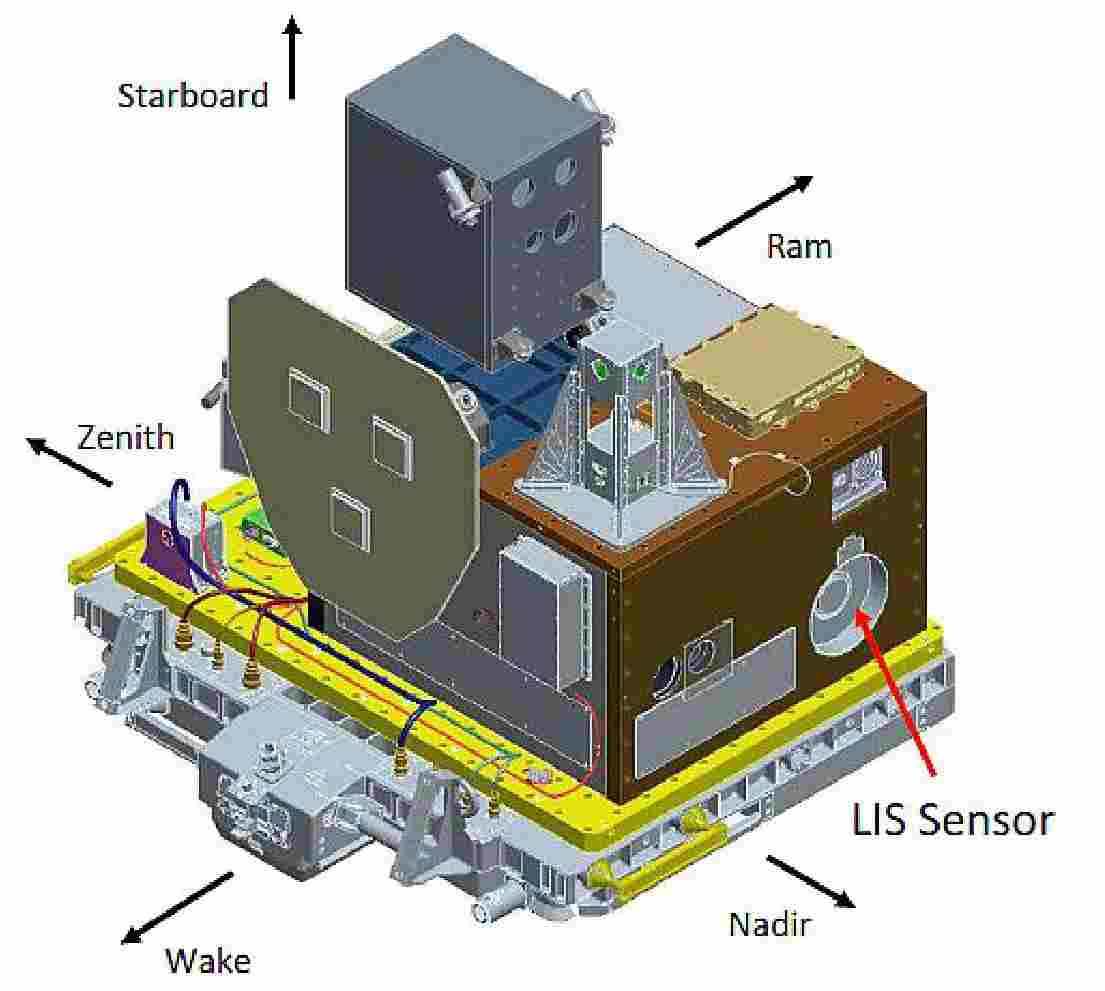 ISS:LIS carries LIS (Lightning Image Sensor). LIS primarily operates as a transient event detector for ISS and is made up of a combination of optical and electrical elements. It is a small solid-state optical imager that detects lightning from a low earth orbit, measuring the time and radiant energy of an occurrence. LIS uses the ISS’s low rate telemetry channel to provide real time lightning data.