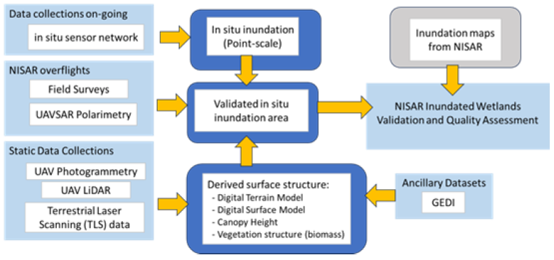 The workflow integrates in situ data, optical and LiDAR aerial drone surveys, and field-portable terrestrial scanning LiDAR to assess inundation and vegetation structure (Figure TBD). This framework aims to support NISAR's mission by providing data for biodiversity assessment and conservation efforts.