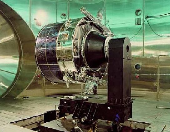Legend to Figure 5: The GEOS qualification model is mounted onto the moment-of-inertia measurement machine in the Dynamic Test Chamber at ESTEC.